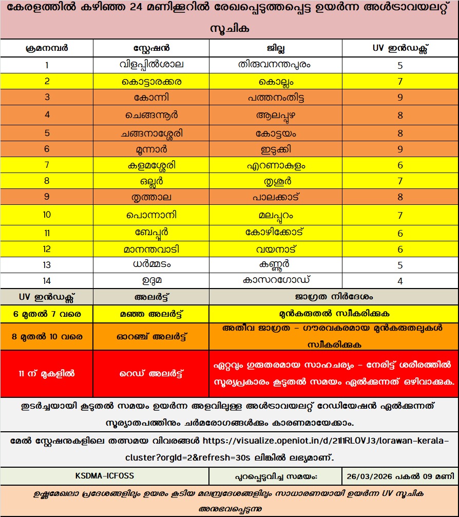 കേരളത്തിൽ കഴിഞ്ഞ 24 മണിക്കൂറിൽ രേഖപ്പെടുത്തപ്പെട്ട ഉയർന്ന അൾട്രാവയലറ്റ് സൂചിക